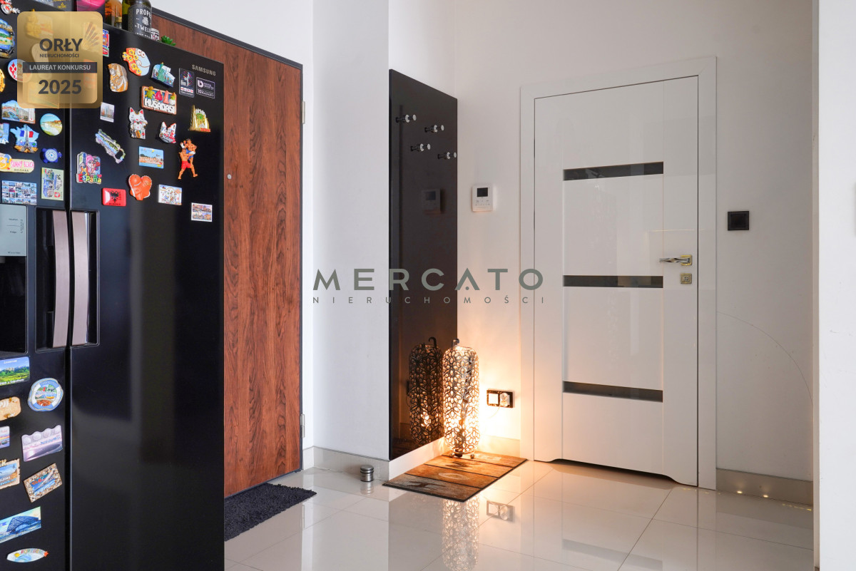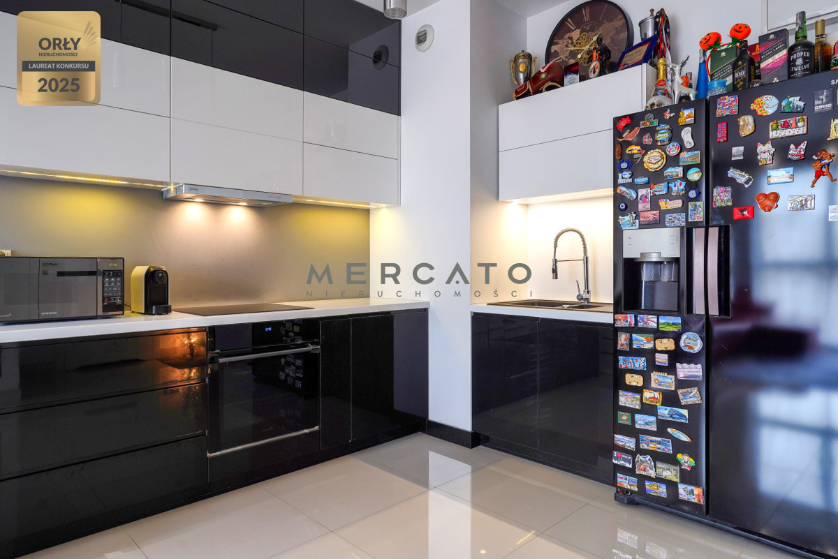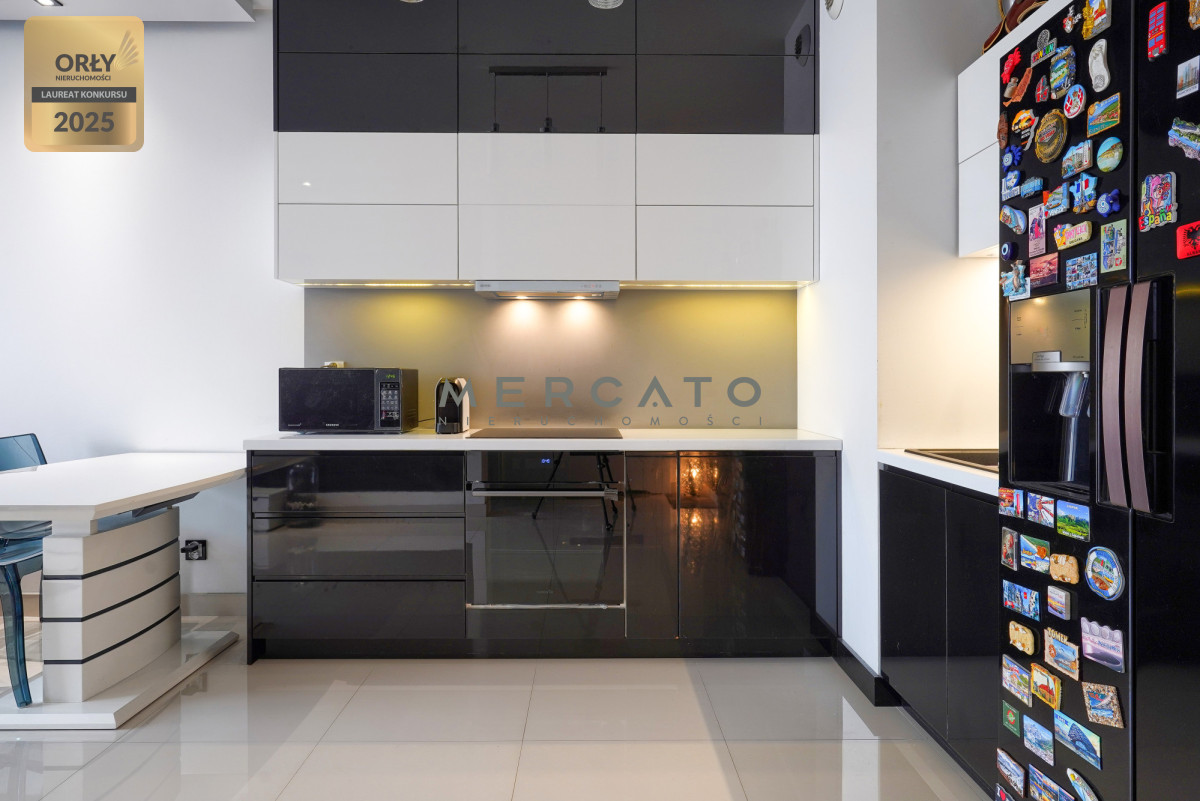 Funkcjonalna, przestronna i jasna kuchnia, zaopatrzona w zabudowany na wymiar, markowy sprzęt AGD (czteropalnikowa płyta indukcyjna, piekarnik, zmywarka, kuchenka mikrofalowa, lodówka). W salonie znajdują się: podświetlany sufit, duża szafka RTV, oraz stół. Wszystko z jednego kompletu, wysokiej klasy w białym połysku.