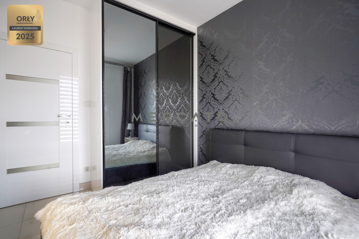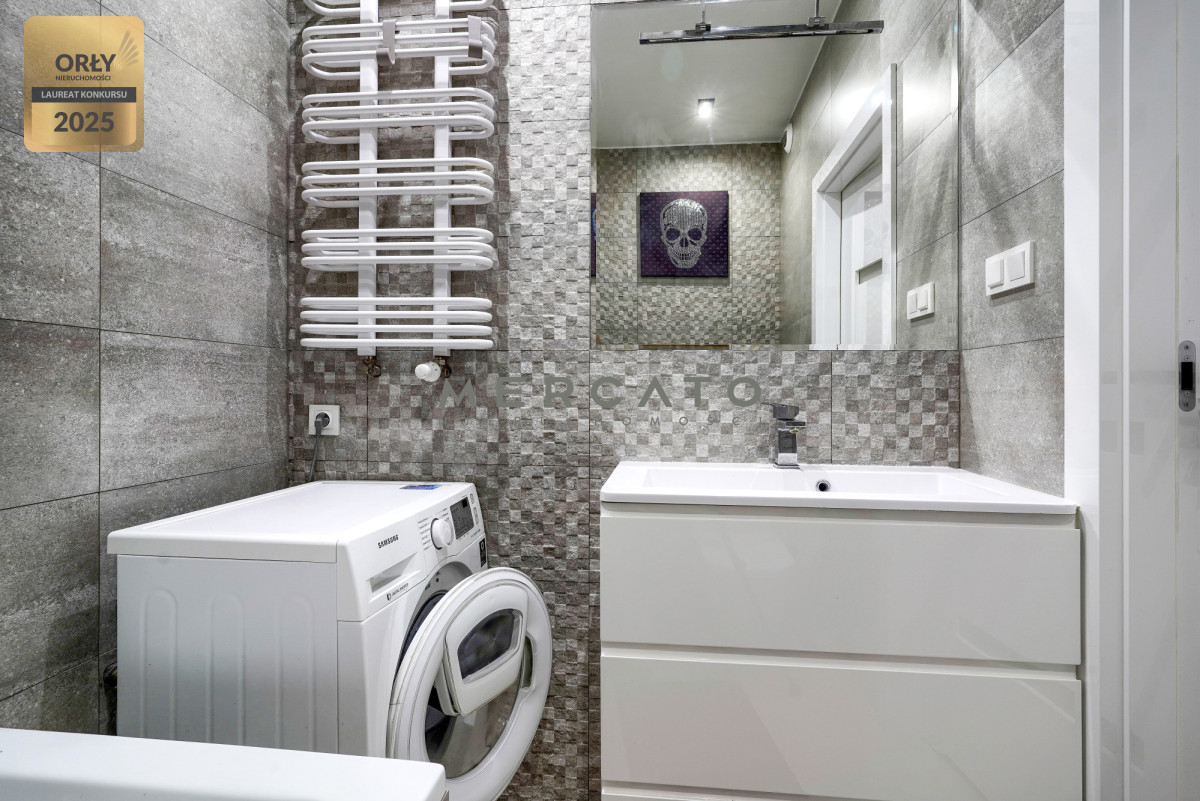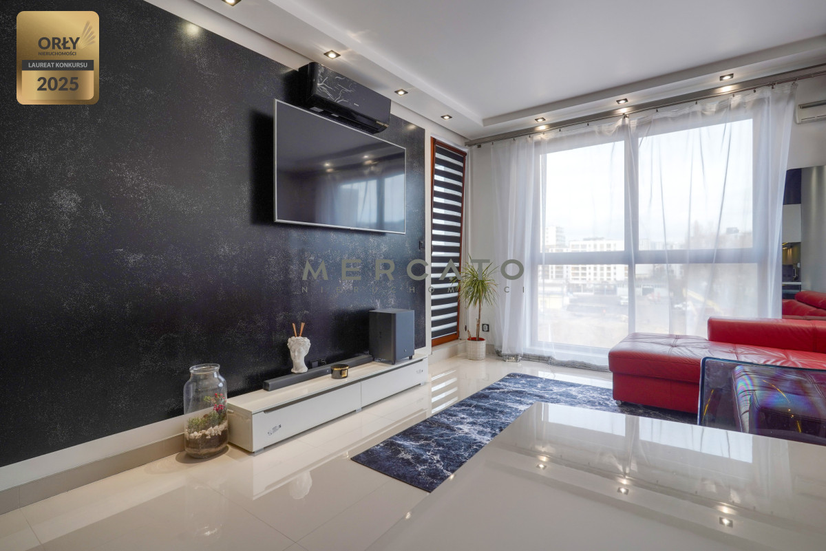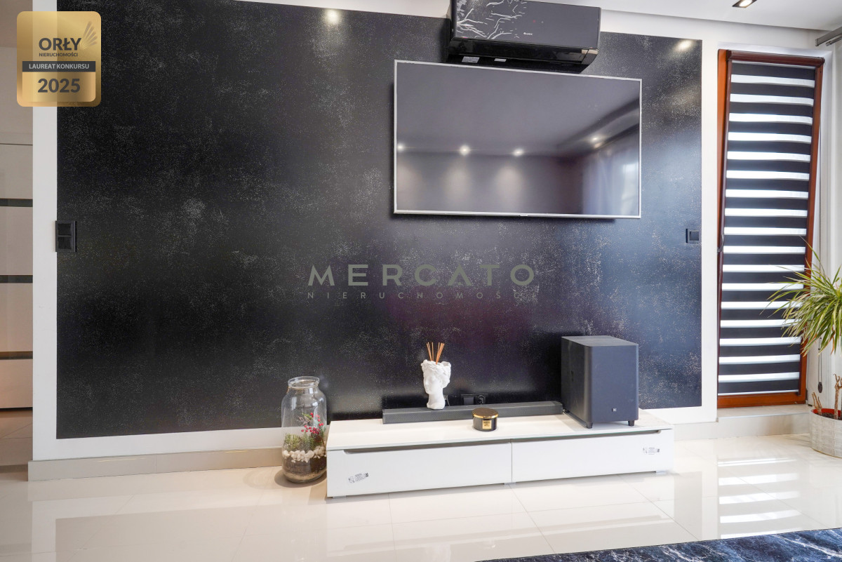 Funkcjonalna, przestronna i jasna kuchnia, zaopatrzona w zabudowany na wymiar, markowy sprzęt AGD (czteropalnikowa płyta indukcyjna, piekarnik, zmywarka, kuchenka mikrofalowa, lodówka). W salonie znajdują się: podświetlany sufit, duża szafka RTV, oraz stół. Wszystko z jednego kompletu, wysokiej klasy w białym połysku.