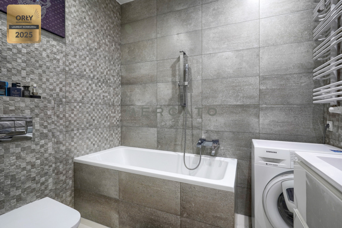 Łazienka wyposażona w pralkę z pojemnym bębnem, wiszącą muszlę klozetową i wannę.