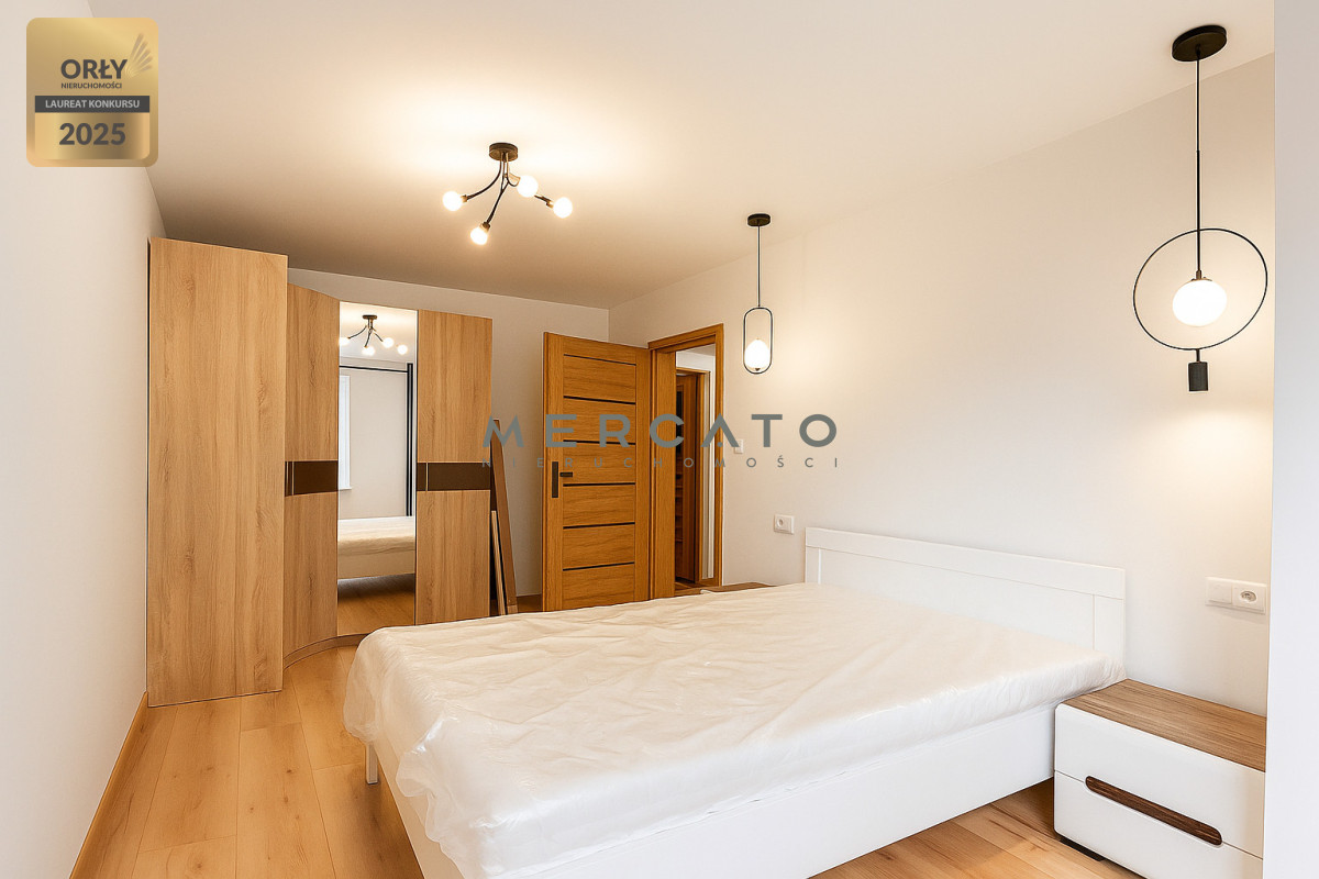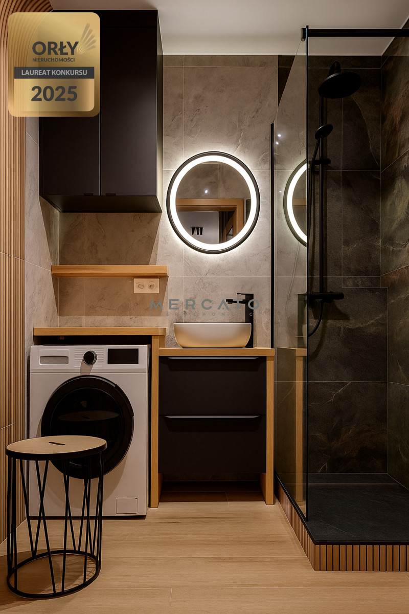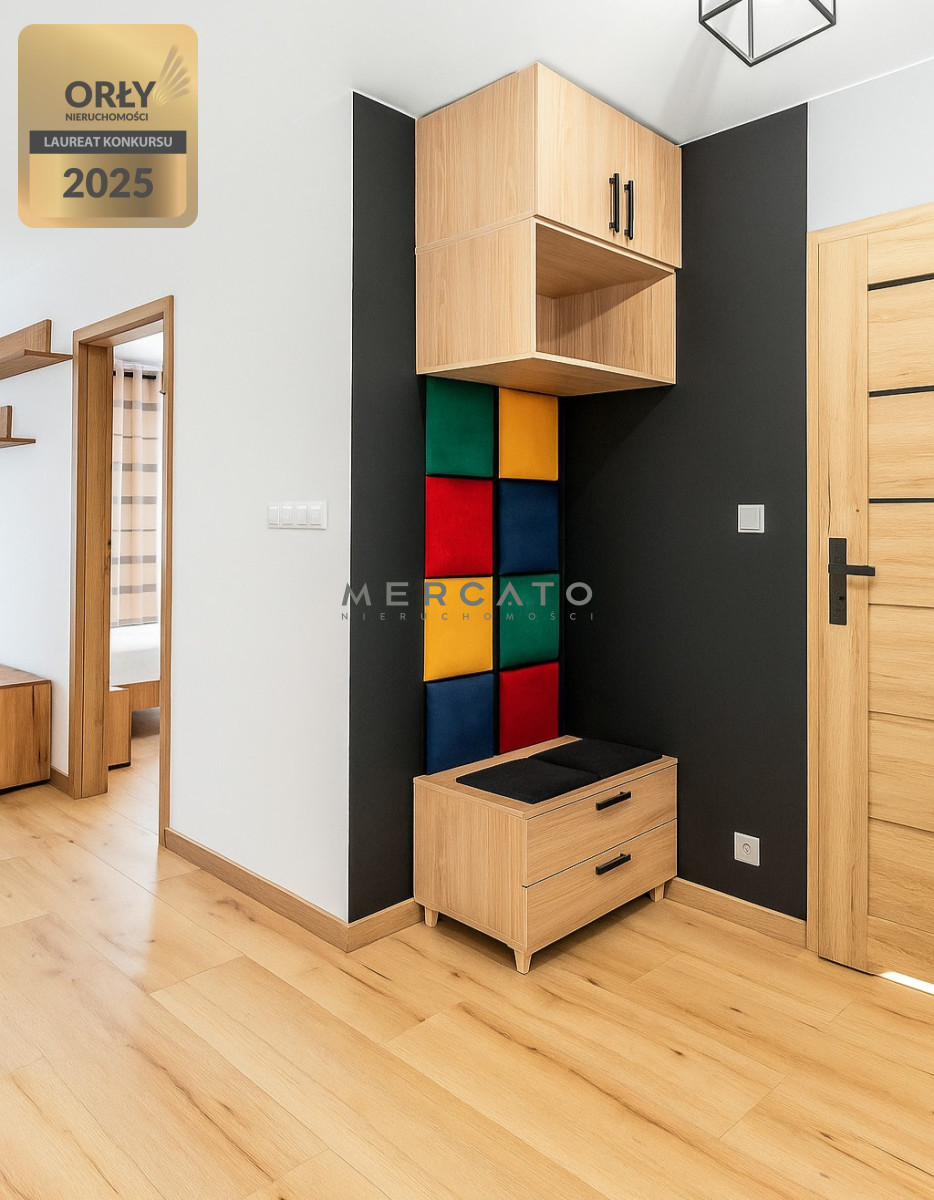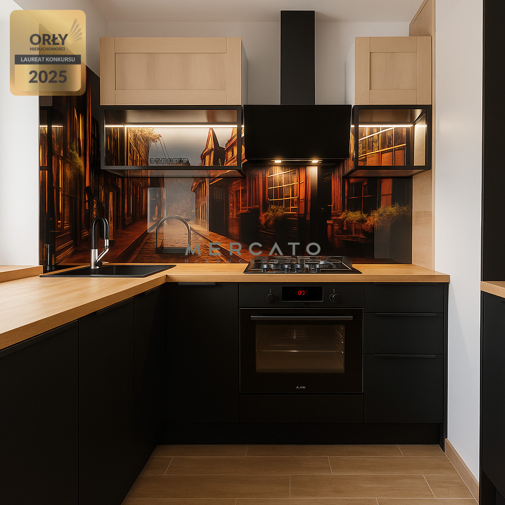 Kuchnia zaprojektowana na wymiar, w pełni wyposażona w nowe sprzęty AGD: lodówkę, piekarnik, płytę kuchenną, zmywarkę i pralkę. W mieszkaniu znajdują się liczne szafy i zabudowy, które zapewniają wygodne przechowywanie.