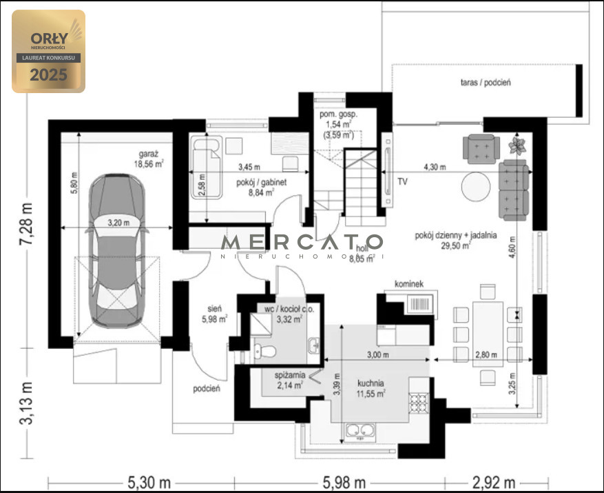 - przestronny salon z jadalnią (ok. 30 m²) z wyjściem na taras i miejscem na kominek