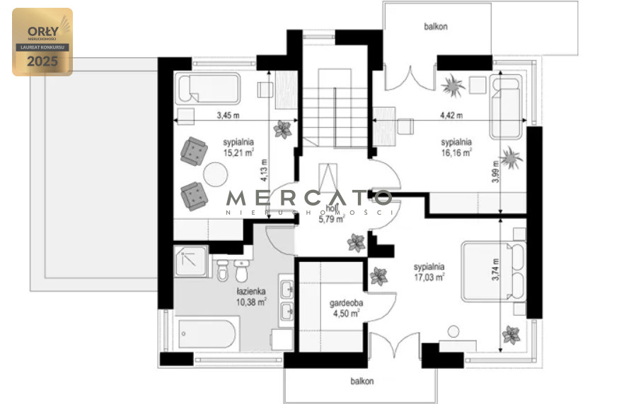 - sypialnia 17 m² z garderobą (4,5 m²) i balkonem