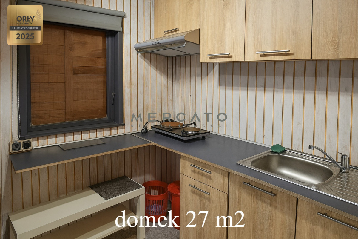 Zabudowania: Na każdej z dwóch ewidencyjnych działek stoi drewniany domek letniskowy - jeden o pow. ~27 m², drugi ~36 m². Układ każdego domku jest zbliżony: salon z aneksem kuchennym, 2 sypialnie, łazienka. Domki są w dobrym stanie technicznym - regularnie konserwowane (impregnacja drewna itp.), wszystkie instalacje sprawne. Przy każdym domku przygotowano miejsce do grillowania. Dodatkowo na posesji znajduje się drewutnia (składzik na drewno) oraz schowek na narzędzia/ sprzęty ogrodowe.