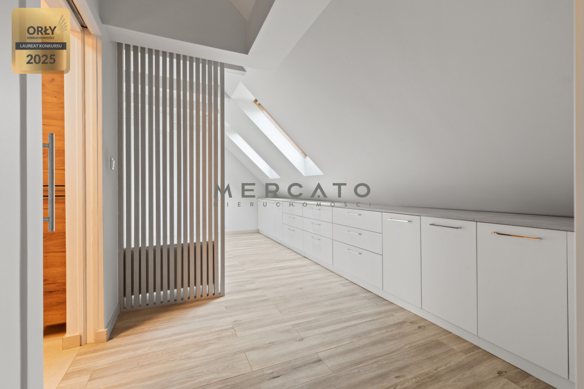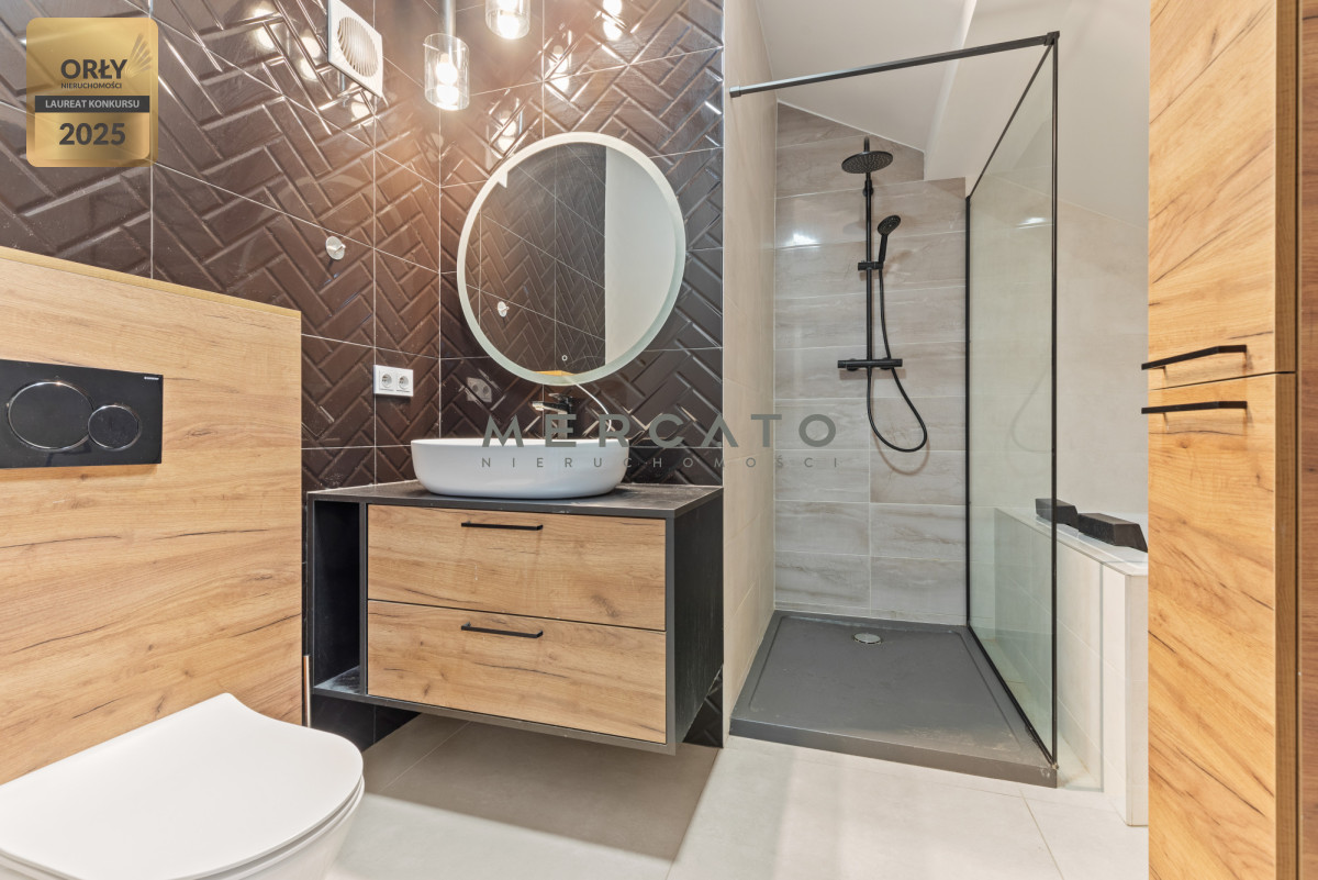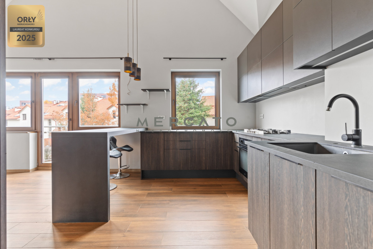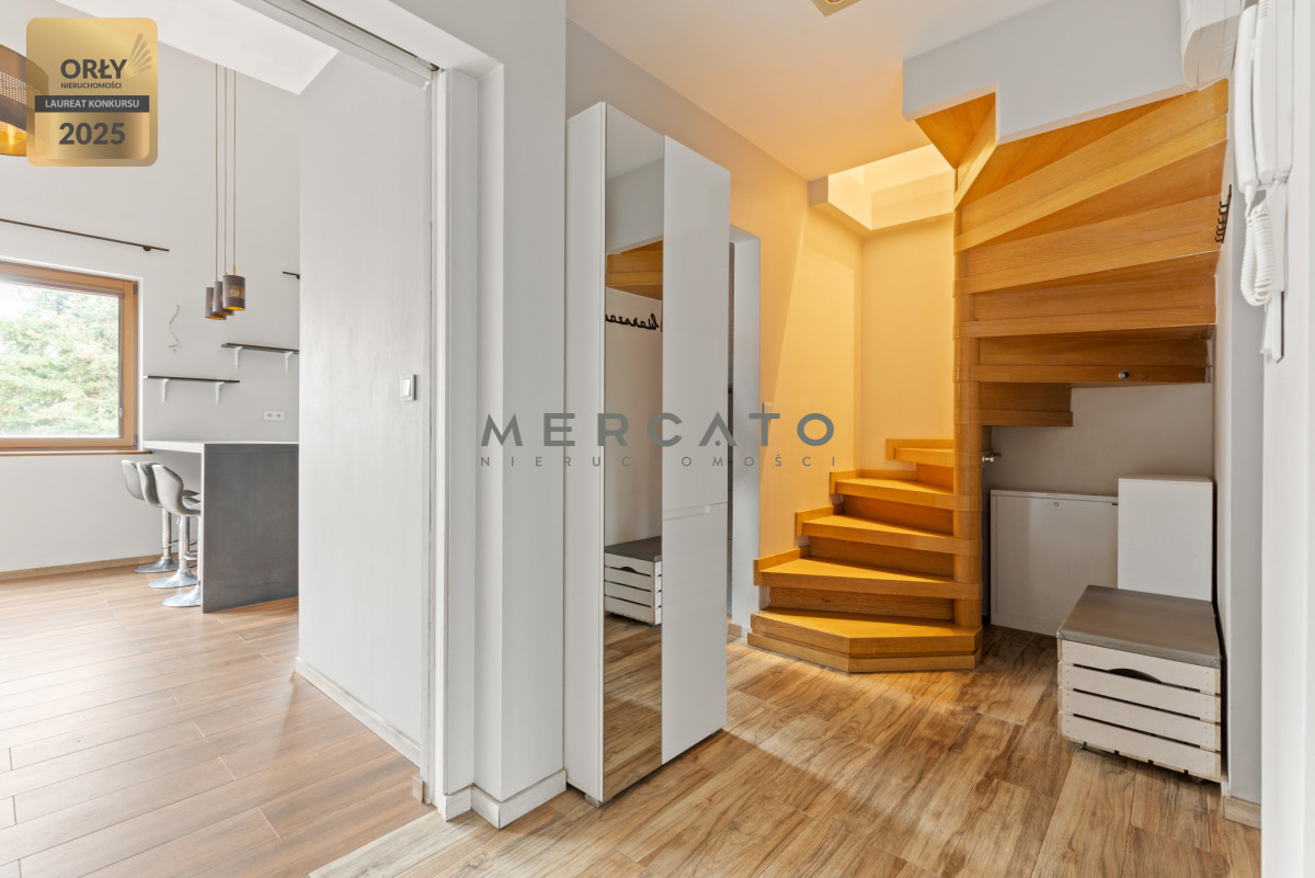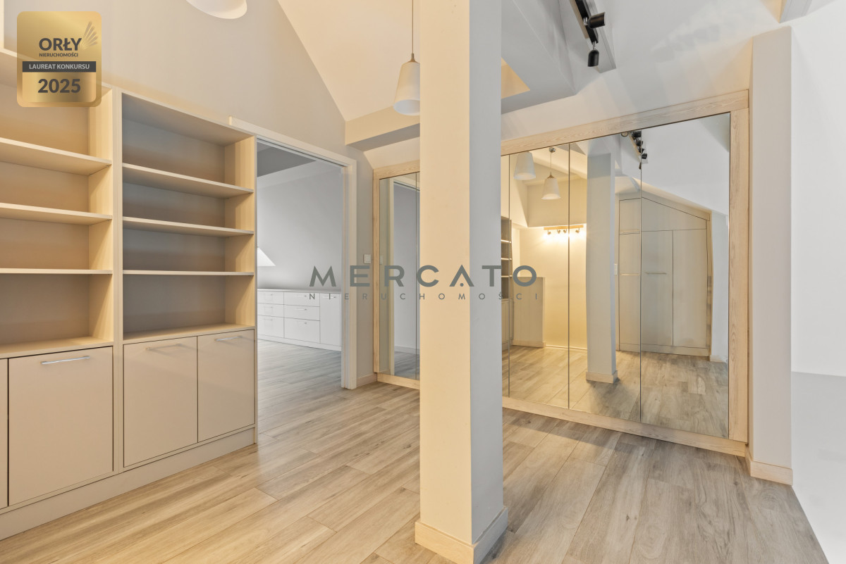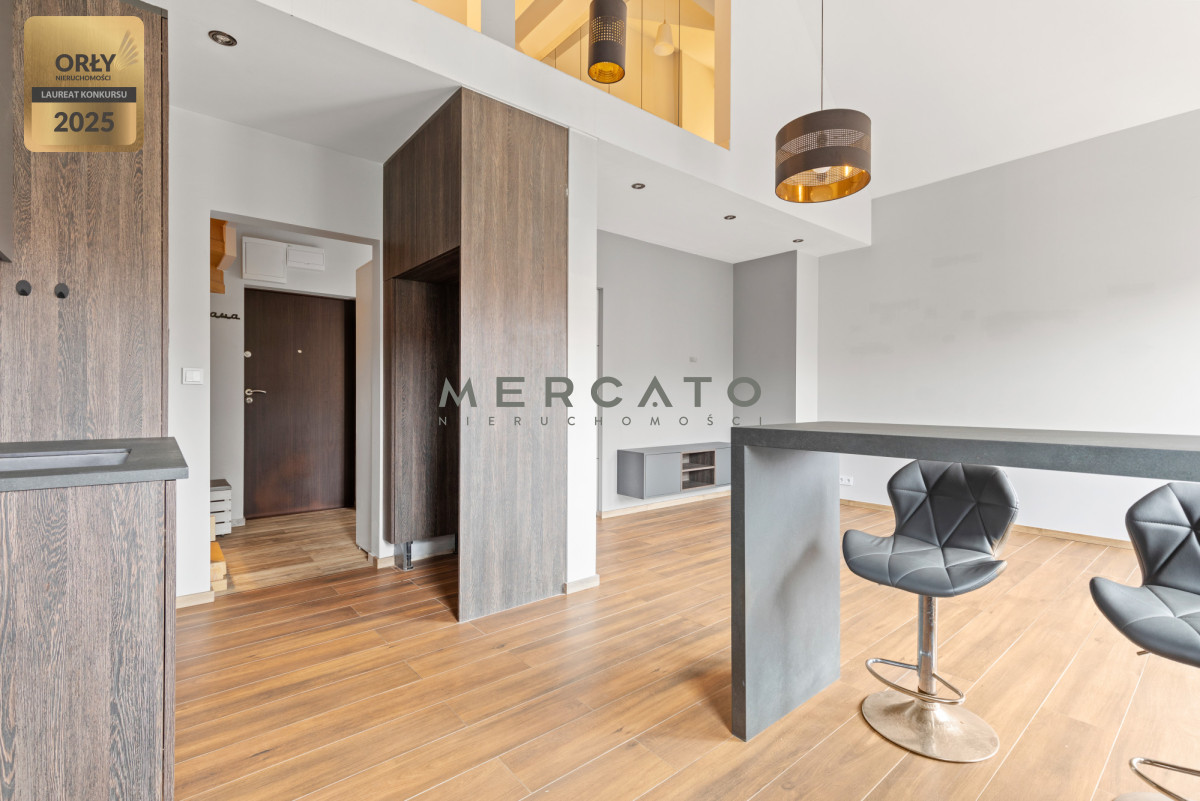 Pierwszy poziom zapewnia przestronny salon z aneksem kuchennym, sypialnię/gabinet, łazienkę oraz balkon. Drugi poziom to przestrzeń z szafami i biblioteczką, sypialnia oraz dodatkowa łazienka z wanną