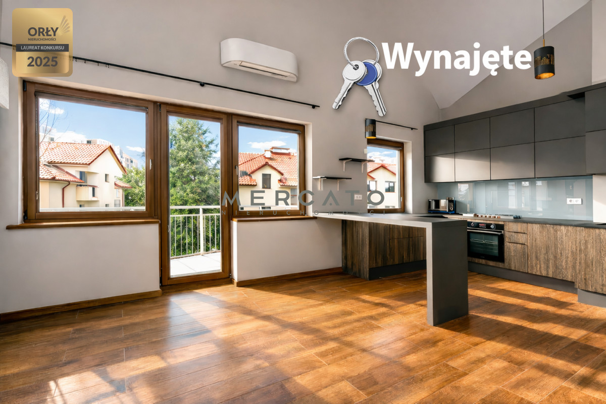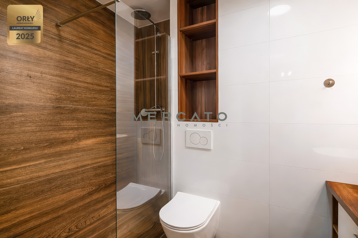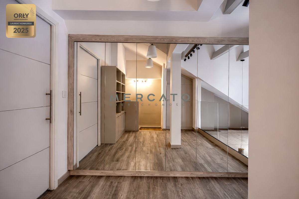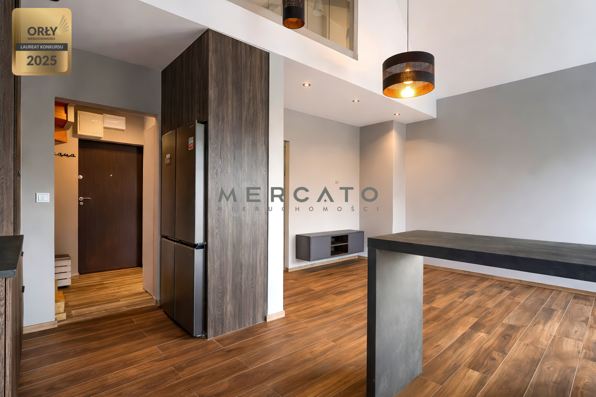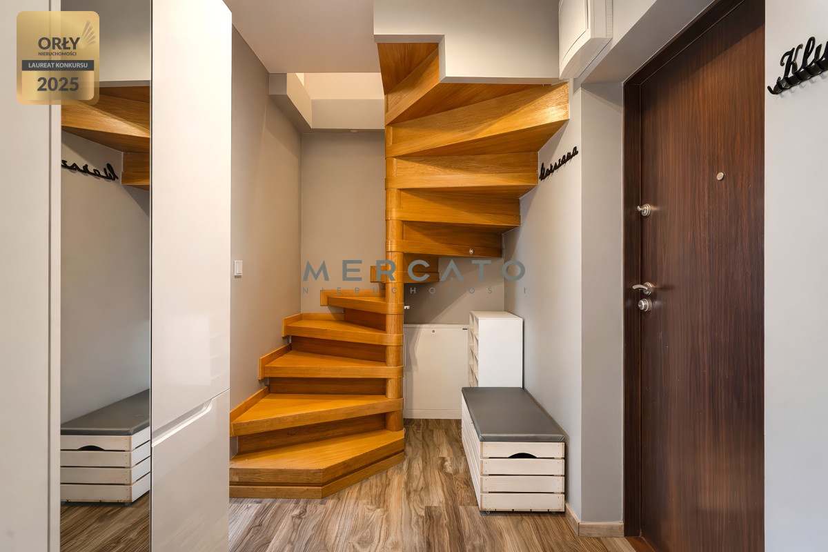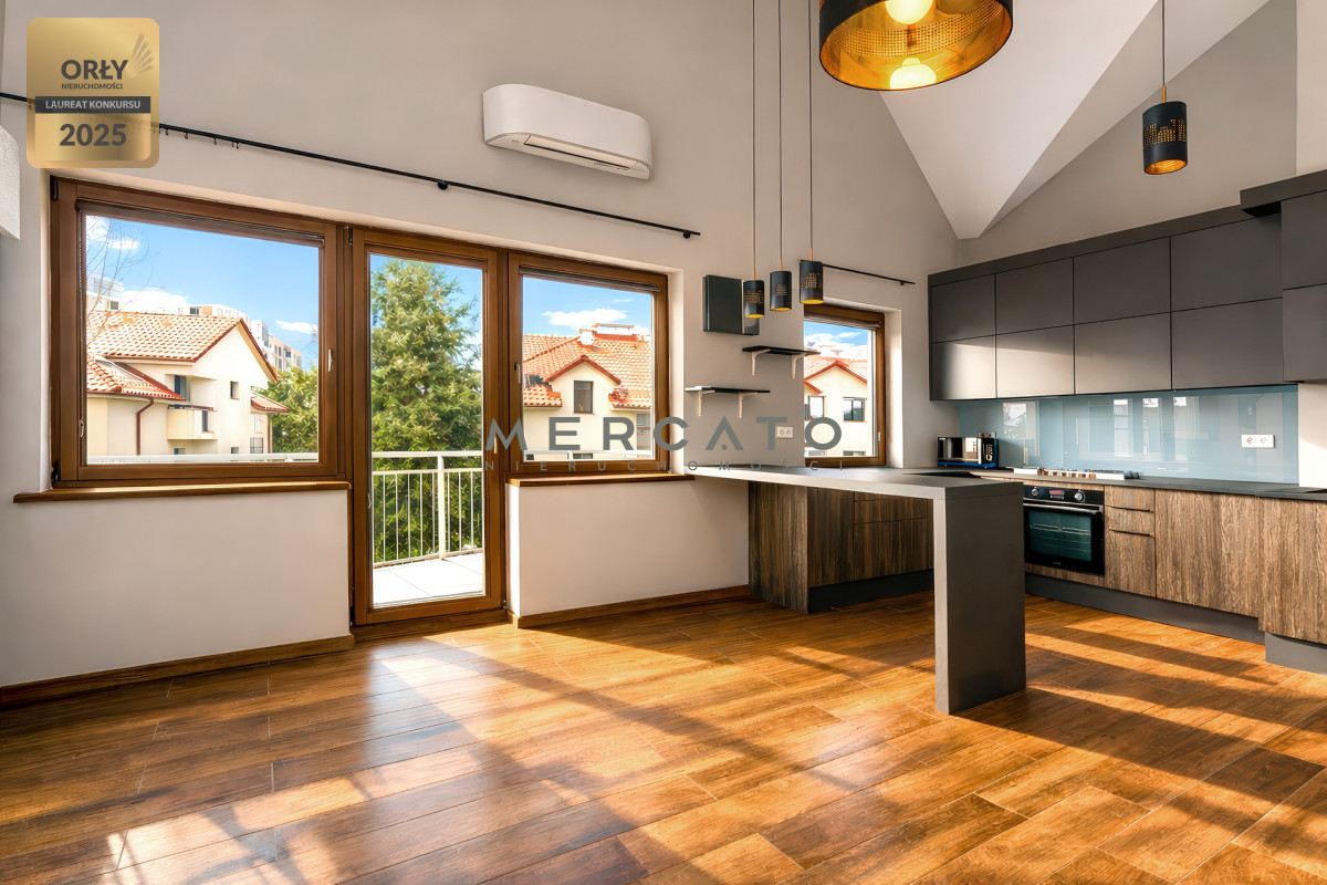 Pierwszy poziom zapewnia przestronny salon z aneksem kuchennym, sypialnię/gabinet, łazienkę oraz balkon. Drugi poziom to przestrzeń z szafami i biblioteczką, sypialnią oraz dodatkowa łazienka z wanną. Mieszkanie posiada klimatyzację.